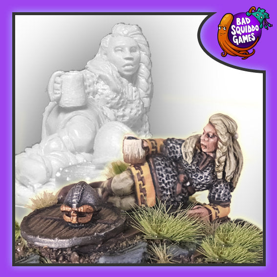 Ahhh, all this raiding makes you thirsty. A shieldmaiden takes a break to put her gear down and have a nice cold beverage. There are as many uses for this as....lots, but I can see her on a round base with a dice to show fatigue on a unit in SAGA.