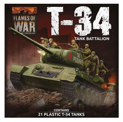This pack contains 21 T-34 Tanks, complete A5 Flames Of War Rulebook, two Decal Sheets, and ten Unit Cards.
