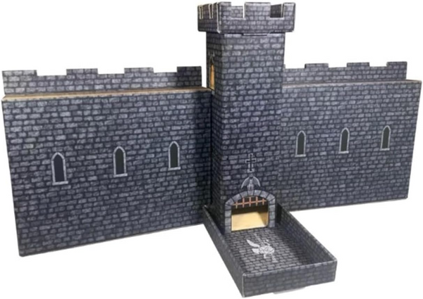 10" Tall castle walls and over 12" tall tower, made of corrugated fiberboard and with 4 internal ramps and rolling tray. Includes a dry-erase turn tracker with 10 magnetic name plates. Designed to scale for use as a gaming prop with 28mm minis. 5"x7"Collector tray comfortably holds over 20 dice! Easily attach your game maps and notes to the back of the castle walls with the included sticky pads. Castle walls large enough to hold your books and notes inside between games; even slots in the side panels to hold your pencils!