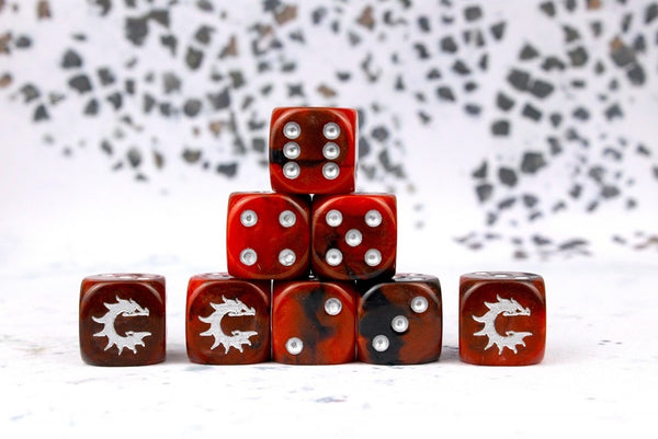 These contain a mixture of red swirled with deep blacks and inlaid with an easily readable red. Total of 25 16MM Resin Dice, where symbols are on the ONE side. Yes, the ONE side.
