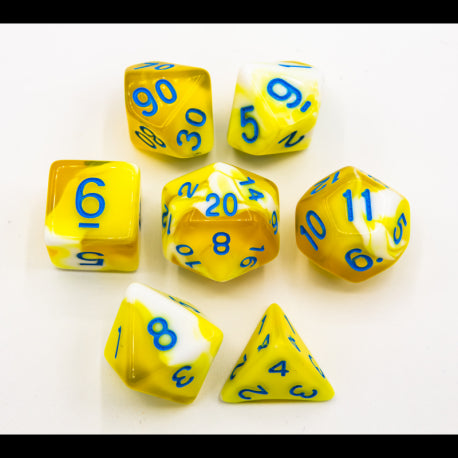 This is for a set of 7 Yellow polyhedral dice with blue numbers for tabletop RPGs.