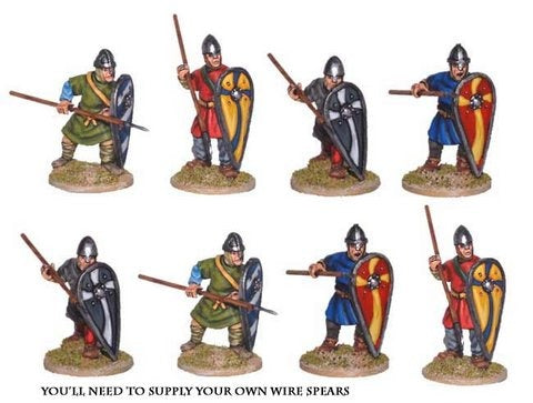 Unarmoured Norman Spearmen. 8 figures per pack. Supplied without spears. 28mm sized figures, made of metal, supplied unpainted. Look to our modelling section of this site for shield transfers to fit these models. Also look to the same section for our wire spears to arm these figures with.