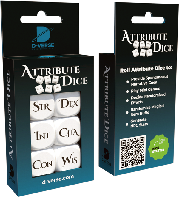 Each side of an Attribute Die features one of the six commonly used character attributes; STR, DEX, CON, INT, WIS and CHA.