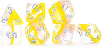 These are a set of 7 layered dice in sweet yellow and gentle amethyst with silver numbers. Contains a d4, d6, d8, d10, d% (00), d12, and a d20. Ships in a clear Dice Keep!