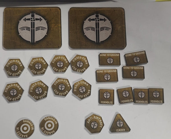 Contains 2x Objective Markers; 2x Ranged In token; 4x Foxholes tokens; 8x Bailed Out/Pinned Down tokens; 4x Gone to Ground tokens; 1x Anti-Aircraft tokens; and 1x Leader token.