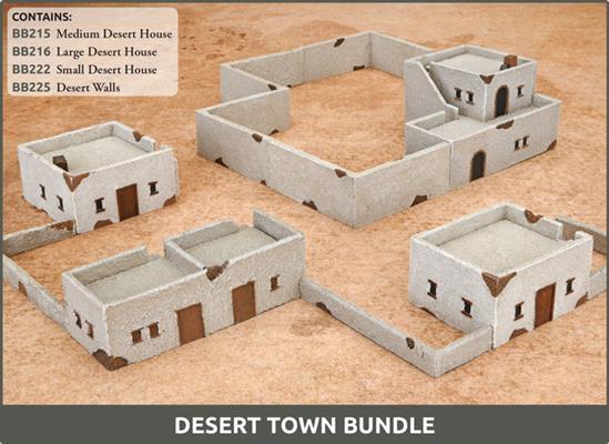 Contains: 1x Medium Desert House, 1x Large Desert House, 2x Small Desert House, 1x Desert Walls set.