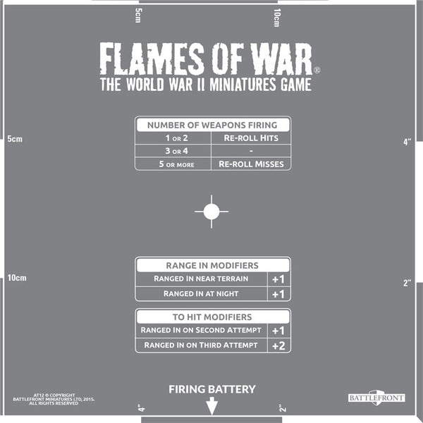 Some weapons lay down such tremendous firepower that they devastate a larger area than normal artillery. For those weapons we have the Salvo template. This template integrates both template sizes in Flames Of War, the Artillery (6”/15cm square) and the Salvo (10”/25cm square) allowing you to measure the area of effect for Artillery, Planes, and Salvo weapons with one tool.