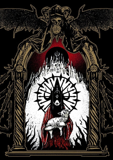 MÖRK BORG GM Screen: A five-paneled portrait wall of death. Printed with gold metallic ink on one side and vivid neon yellow on the other. The front is all art, five scenes of various locales and important characters in the Dying world. The GM-facing side sports a wide array of tables and rules summaries that might come in handy during play.