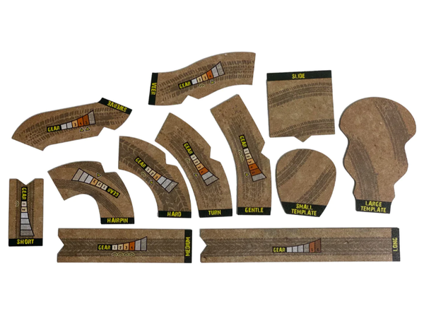 Set includes each of the 12 templates designed for Gaslands Refuelled. These are the same as the templates illustrated in the rulebook, with full-colour artwork and double-sided!