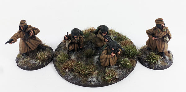Contains five metal 28mm WWII Hungarian command figures in winter uniform. Consists of one officer, one medic and 3-man MG30 machinegun team.
