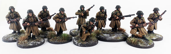 Contains ten metal 28mm WWII Hungarian riflemen figures in winter uniform.
