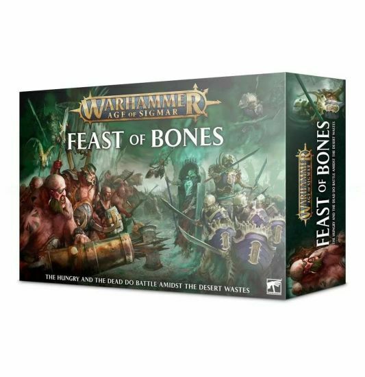Contains the Feast of Bones Collection. This includes Feast of Bones rulebook, War Hammer Age of Sigmar core rule book, Token sheet, 8 warscrolls, and 26 Warhammer Age of Sigmar miniatures. Stage your own battle between the legions of the Ossiach Bonereapers and Ogors, fighting for supremacy on the Endless Boneyard.