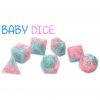 These are a set of 7 polyhedral dice with POWDER PINK & DENIM BLUE W/ SILVER NUMBERS. Contains a d4, d6, d8, d10, d% (00), d12 and a d20. Ships in a clear Dice Keep!
