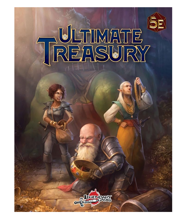 Over a Thousand Terrific Treasures. The Ultimate Treasury is an encyclopedic guide to treasure of every kind for DnD 5th Edition, from commonplace potions and simple utility items to legendary weapons, awesome artifacts, and a humongous hoard of truly legendary loot! You'll find items aplenty for any kind of campaign, from traditional fantasy to ancient treasures of the desert tombs, fey baubles to pirate loot, the armaments of crusading knights and tools for clever roof-running footpads, plus items inspired by an array of real-world cultures and items tailored specifically for use with every core 5E class! Plus get tables galore to generate detailed hoards jam-packed with an exciting assortment of treasures for every level, so no hoard will ever be the same! Of course, treasures are not limited to shiny baubles and enchanted implements! Sometimes knowledge is the greatest power, and the Ultimate Treasury also includes spellbooks of untold power and librams of lost lore and martial mastery. You'll also find an incredible array of mundane, mechanical, alchemical, and technological gear from blackfire clay, troll oil, and soul stimulant to arc rifles, singularity grenades, and scatterlight suits! Plus, terrible cursed items and awesome artifacts aplenty! Last but not least, treasure must be protected, and you'll find a menagerie of guardian monsters like the abandoned armory, goldbug, glisterfae, and ioun golem to keep your loot safe from marauding adventurers! You'll find over 1,000 items, spells, creatures, and more in these pages, beautifully illustrated, organized by category, and ready to reward your heroes for their triumphs! You can make this book even better with our decks of Legendary Loot Cards for ease of use at the table! Whether you use this beautiful book, our card sets, or both, we hope this fantastic 346-page collection of marvelous magic, amazing alchemy, and terrific technological treasures for 5E helps Make Your Game Legendary!