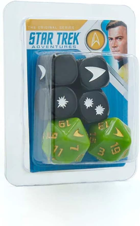 Welcome to your new assignment, Captain. Your continuing mission, to explore strange new worlds, seek out new life and new civilizations, to boldly go where no one has gone before Star Trek Adventures takes you to the Final Frontier of the Galaxy, where new discoveries await keen explorers of Starfleet. Star Trek Adventures Kirk's Tunic Dice, Engage in Star Trek Adventures roleplaying with the official Captain Kirk's tunic themed roleplaying dice set. Features two twenty-sided dice with a custom captain's tunic design, and four six-sided challenge dice for use with Star Trek Adventures. Previously only available in the Star Trek Adventures Tricorder Collector's Box Set.