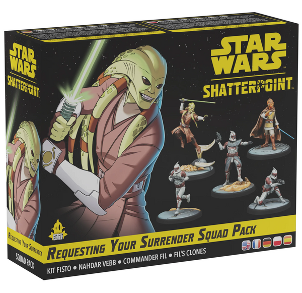 The Requesting Your Surrender Squad Pack brings characters from the heart of the Clone Wars to Star Wars™: Shatterpoint! Taking it right to the Separatists, Jedi Master Kit Fisto, his Padawan turned Jedi Knight, Nahdar Vebb and Clone Commander Fil along with Fil’s Clones are in this pack.