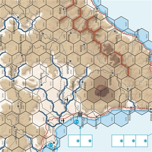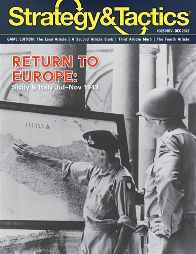 Return to Europe: Sicily & Italy July–Nov 1943 is a two-player sequel to Desert Fox Deluxe covering the Allied invasion of Sicily and southern Italy. The operation was viewed as only a limited offensive to secure the Mediterranean and force Italy out of the war. The Germans also intended only a limited effort to delay the Allies while a strong defense was established at the far north of the peninsula. Both sides scented greater possibilities in the early going and were drawn into what would become a grueling and expensive campaign. There are two scenarios, each covering all or part of the campaign. One player or team of players commands the Allied forces, the other the Axis. In general terms the Allies are trying to knock Italy out of the war and seize the greatest amount of territory as possible, while the Axis seeks to maintain control of Italian territory for the maximum amount of time. Each game turn represents one month with up to six player impulses in each GT. Each hex represents 6.7 miles (10 kilometers) from side to side. Combat units represent brigades/regiments to companies.