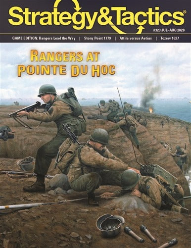 Rangers: Lead The Way is a solitaire simulation of the US Army Ranger assault on the Pointe du Hoc on D-Day. The game challenges the player to do better than the actual Ranger attack up the cliffs that historic morning and additionally allows the player to fight the battle using the planned, rather than the actual, forces and landing beaches. The scenarios cover action through 0300 June 7, a span of almost 24 hours. The area movement map uses one inch representing one-quarter of a mile. Scale: Ranger units are groupings of 3 to 12 men, with the Germans shown at squad level and counters representing heavy artillery and machinegun emplacements.