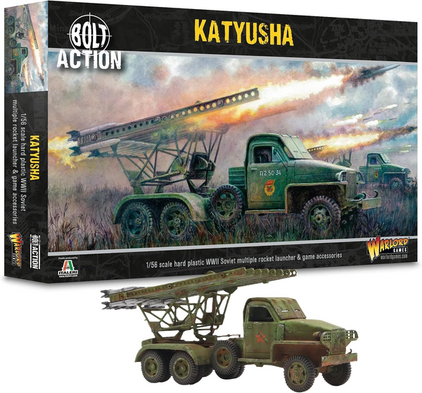 Rain fire from the skies with the mighty Katyusha! A simple and very Soviet concept, the name ‘Katyusha’ refers to a long series of truck-mounted multiple rocket launcher systems, designed to provide a massive barrage against a target, then quickly reposition and strike again to avoid counterbattery fire. A wide variety of rocket sizes and trucks would be used, with one of the most common being the BM-13 launcher mounted on Lend-Lease Studebaker trucks. On the Bolt Action tabletop, the Katyusha sports a powerful Multiple Rocket Launcher, a weapon which requires both skill and luck to employ, but has absolutely devastating potential to cause damage. It’s a great piece of low-cost self-propelled artillery, and no Soviet Armoured Platoon is complete without at least one! Deliver a deadly barrage today! Box contains one plastic Kayusha multiple rocket launcher with two crew miniatures, assembly booklet, decal sheet and vehicle damage markers.