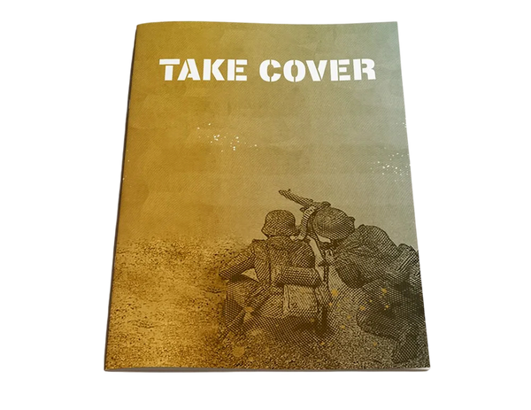 Each copy of Take Cover contains the following: One travel size game box, 1 sheet of counters, 2 sets of rules (1 for each player), 72 cards, One 10 sided die, tray
